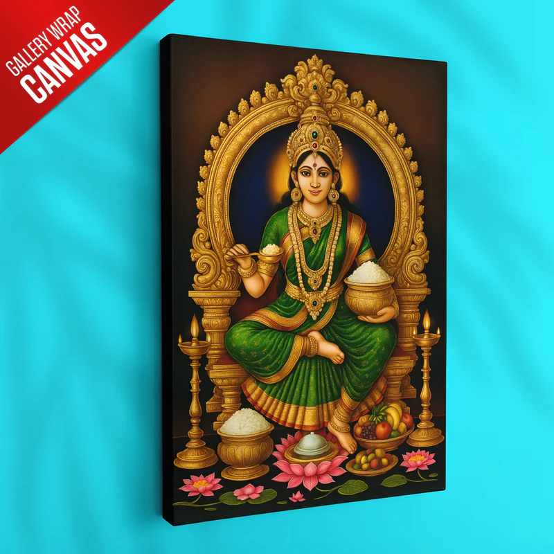 Invite prosperity, nourishment, and divine grace into your space with Maa Annapoorna Devi – Abundance Wall Art. Maa Annapoorna Devi is revered as the goddess who blesses households with food, wealth, and fulfillment, making this artwork perfect for kitchens, dining areas, and prayer rooms.